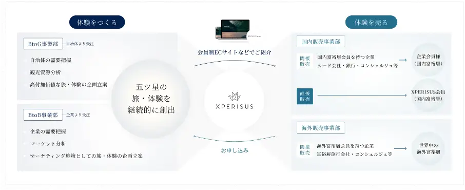当社は、「100 年先の未来へ、日本中の多様な文化が継承される『仕組み』を創る」という企業理念のもと、持続可能な観光に よる地方創生を実現する"社会インフラ"を実装するため、2017 年 1 月の設立以来、訪日富裕層旅行市場 No1 プレイヤーを 目指してまいりました。BtoB 型クローズド EC サイト「XPERISUS.com」のリリースを皮切りに海外富裕層向け事業を開始しまし たが、COVID-19 パンデミックの影響により一時的に海外販売事業を停止。しかし、この期間を事業基盤強化の好機と捉え、 国内富裕層向け事業、法人向け事業(BtoB)、官庁自治体向け事業(BtoG)へと事業領域を戦略的に拡大いたしまし た。