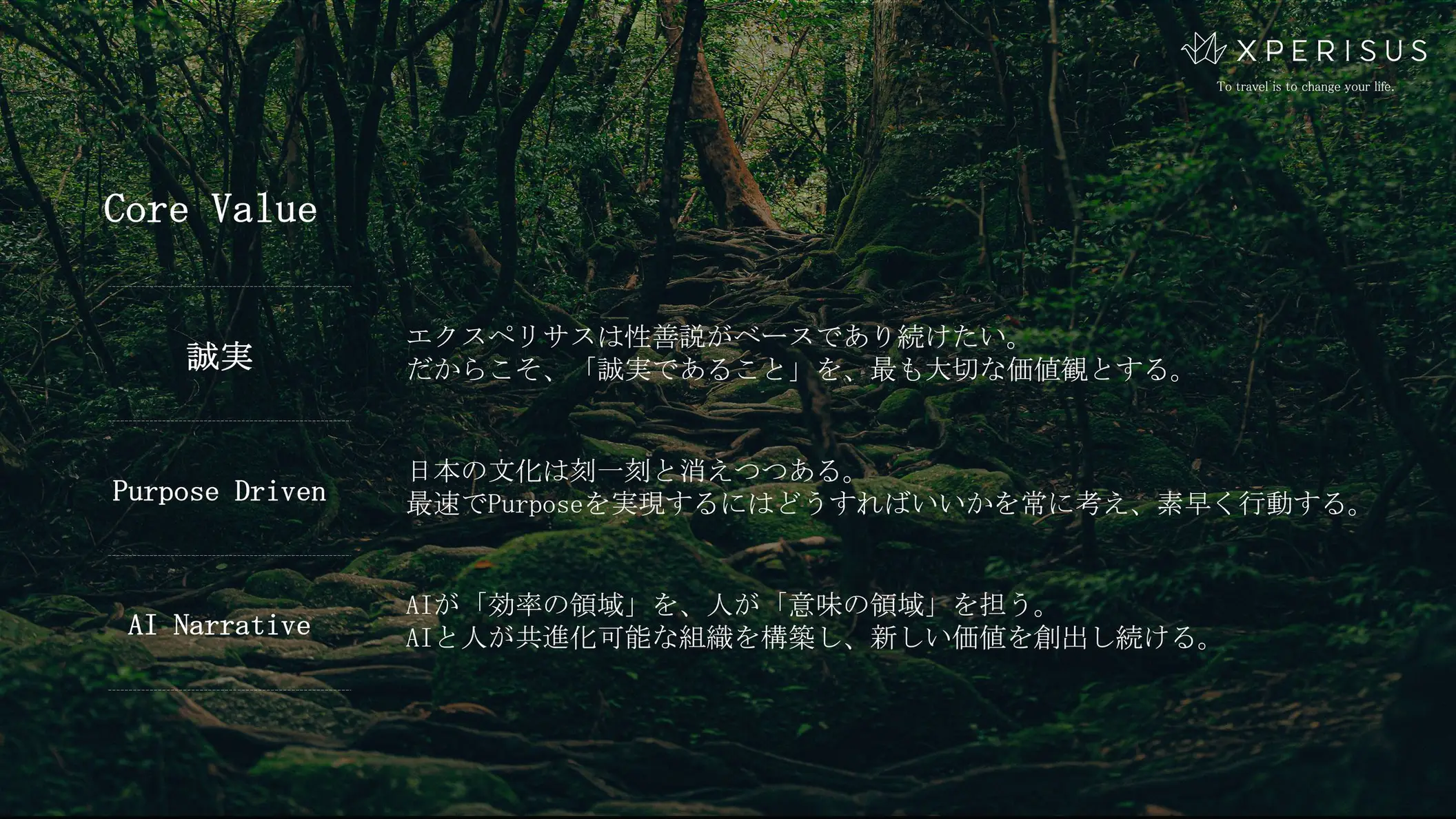 「100年先へ、文化が受け継がれる『仕組み』を創る。」をPurposeとし、訪日富裕層向けの高付加価値な旅・体験を企画・開発から販売・流通まで一気通貫で推進するエクスペリサス株式会社(本社:東京都渋谷区、代表取締役:丸山 智義)は、このたび従来のMission・Vision・Value(MVV)を見直し、企業の存在意義と価値観を明確にした Purpose・Value へと刷新いたしました。