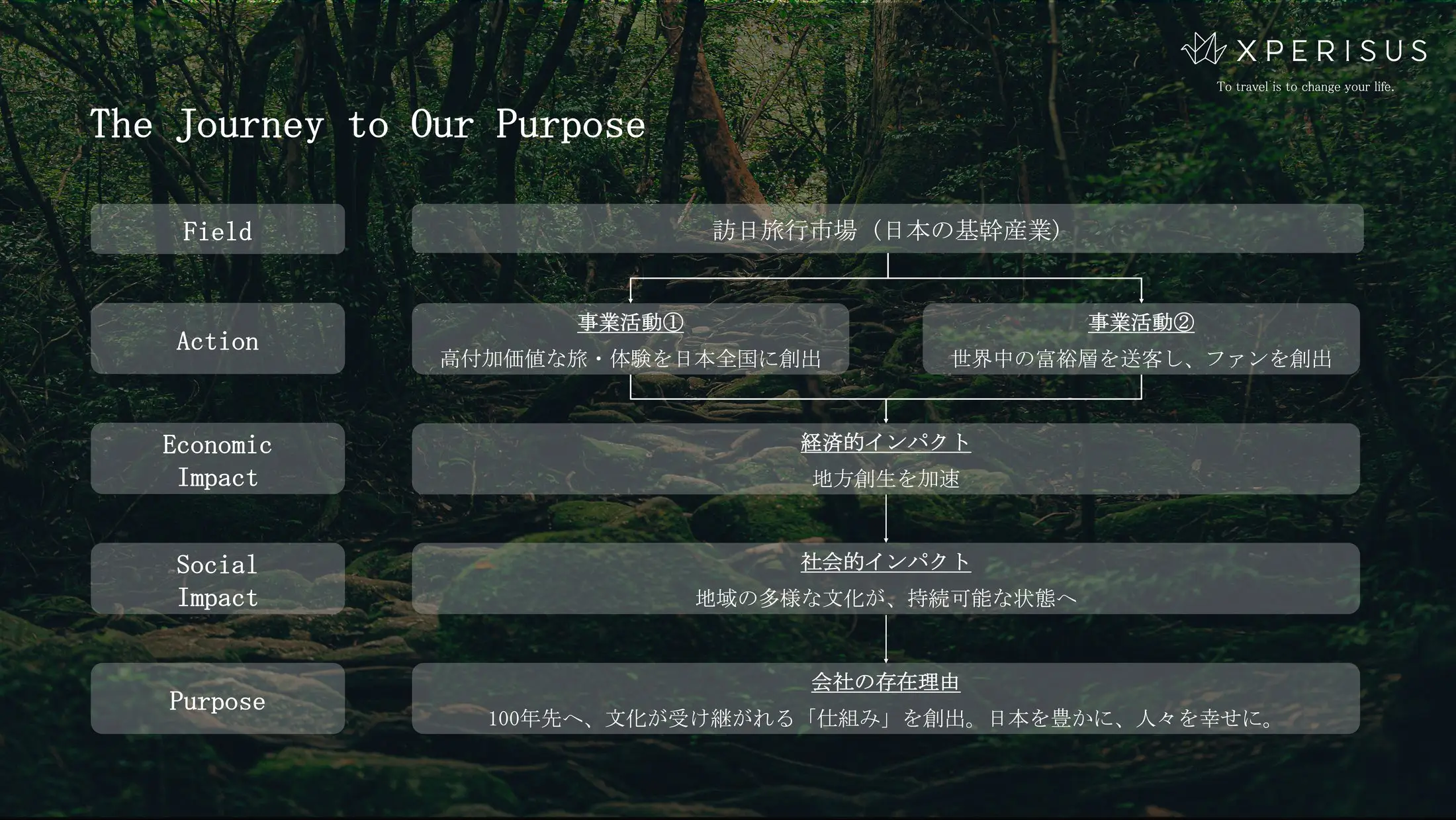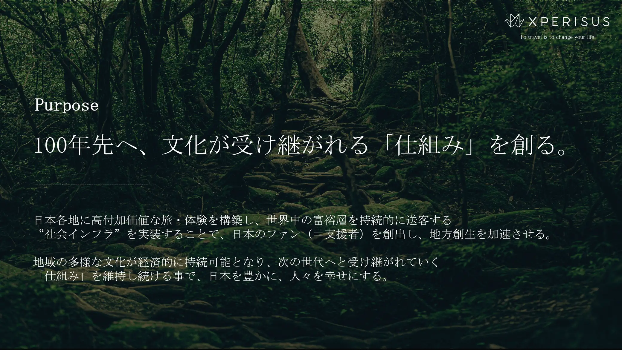 日本各地に高付加価値な旅・体験を構築し、世界中の富裕層を持続的に送客する"社会インフラ"を実装することで、日本のファン(=支援者)を創出し、地方創生を加速させる。地域の多様な文化が経済的に持続可能となり、次の世代へと受け継がれていく「仕組み」を維持し続けることで、日本を豊かに、人々を幸せにする。